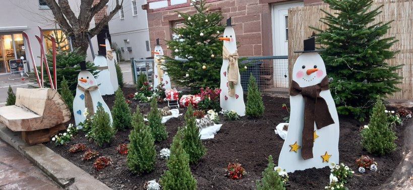 Im Voraus wurde gesägt, gemalt und geklebt, Pflanzen gekauft, Lichterketten entstaubt und so mancher dekorative Schatz im Keller gefunden. Alles zusammen wurde nun im Beet zu einer wunderschönen Winterlandschaft mit großen und kleinen Schneemännern, verschiedenen Winterpflanzen und bunten Weihnachtspäckchen unterm Tannenbaum. Und bei Nacht funkeln hunderte von Lichtern an den Tannenbäumen als Vorboten der Weihnachtszeit.
